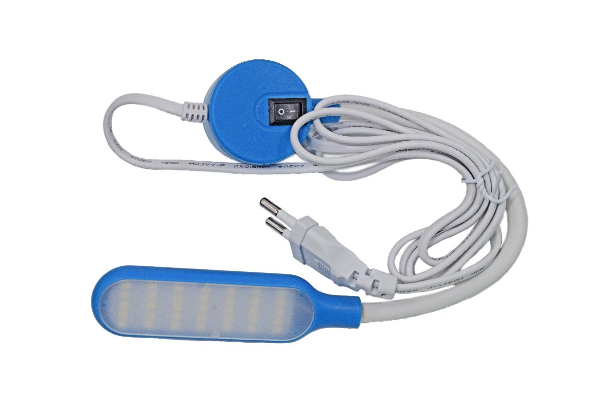 Лампа на гибкой стойке имеет магнит для крепления, кнопку регулировки яркости, кнопку включения/выключения, вилку для подключения к розетке.