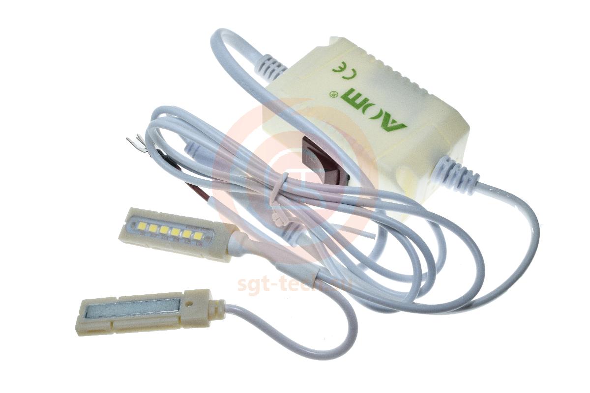 Лампа на магнитах, имеет по 6 светодиодов на каждой из двух частей, кнопку вкл/выкл, провода для подключения к швейной машине.