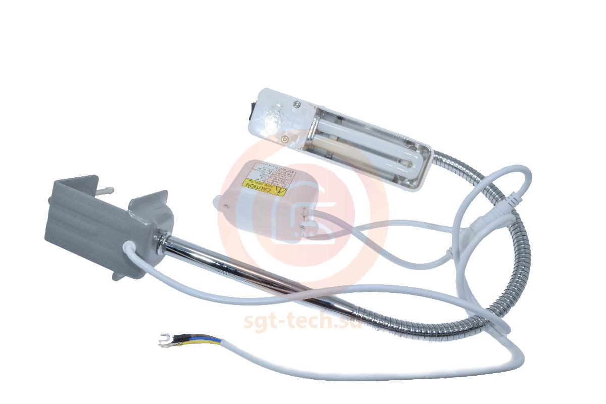 Лампа имеет гибкую стойку, крепление к столу (струбцина), кнопку включения/выключения, клемы для подключения к швейной машине.