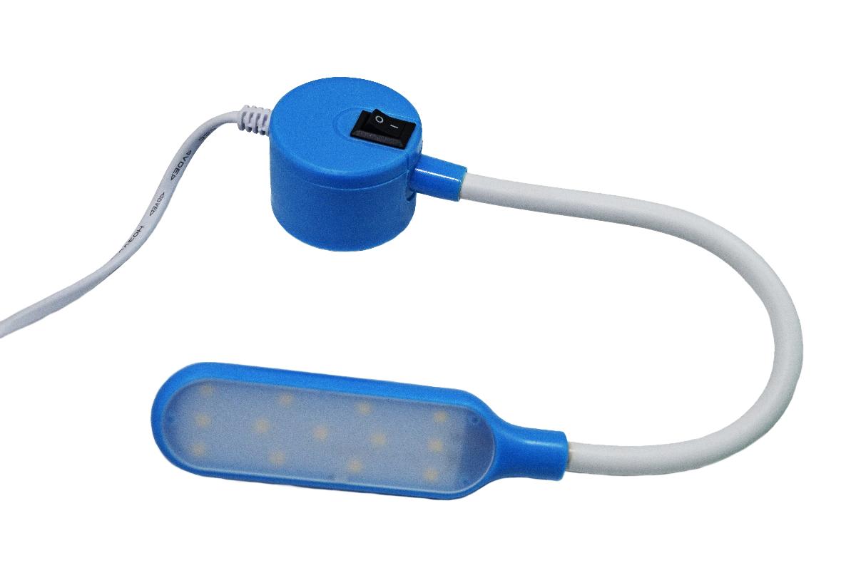 Лампа на гибкой стойке оснащена 13 светодиодами, магнитом для крепления, кнопкой включения/выключения, вилкой для подключения к розетке.