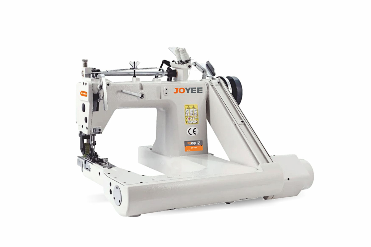 Двухигольная швейная машина двухниточного цепного стежка с П-образной платформой и силиконовым податчиком. Предназначена для легких и средних тканей .